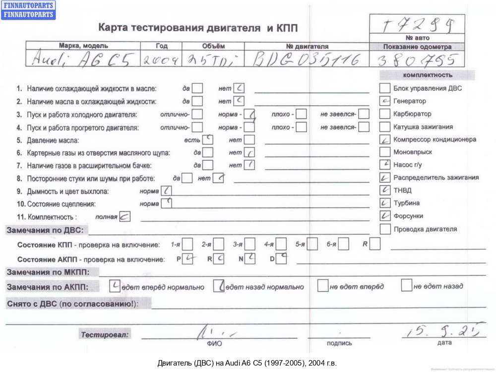Компания FINNAUTOPARTS занимается продажей контрактных (б/у, бывших в употреблении) запчастей для иномарок. В нашей компании продаются только оригинальные запчасти из Европы, Японии и Кореи, которые не имеют пробега по РФ. Если вы хотите приобрести двигатель (ДВС) (дизельный) для а/м Ауди А6 С5 (Ц5), смело обращайтесь в нашу компанию. Все наши менеджеры — профессионалы своего дела, и с удовольствием помогут вам купить запчасти, в том числе, двигатели (ДВС) дизельные, на Audi A6 (C5) и другие автомобили.